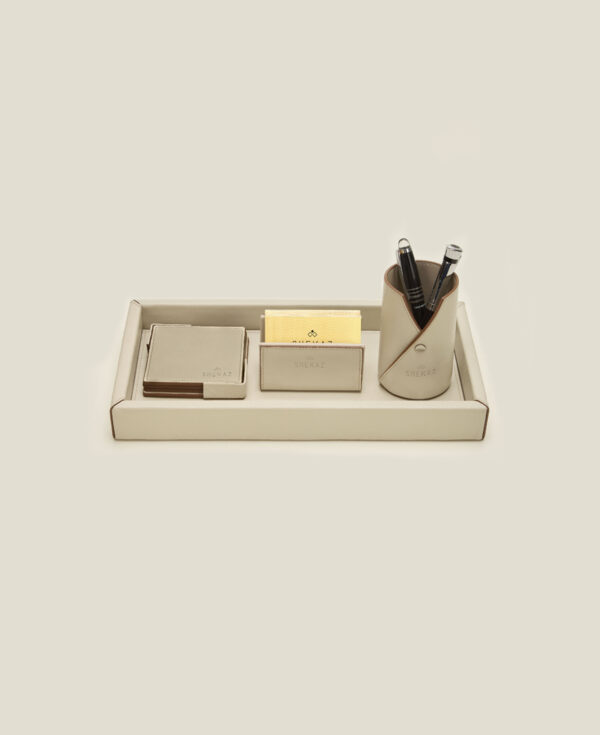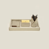 Le Coffret Élite incarne le raffinement dans chaque détail. Son plateau rectangulaire devient la scène d’un bureau ordonné, accompagné d’un porte-crayons et d’un porte-cartes de visite qui reflètent votre professionnalisme. Les sous-verres en cuir complètent l’ensemble avec subtilité, transformant chaque pause café en un moment d’élégance. Plus qu’un coffret, c’est une signature de style et de distinction