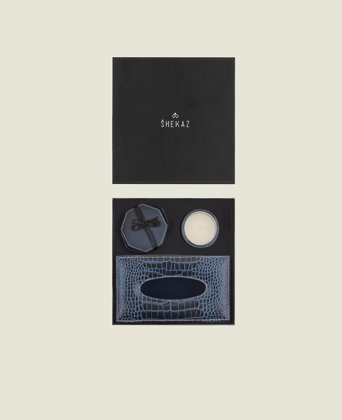 Le Coffret Jasmin transforme votre espace en un coin pratique et agréable. Le bougeoir en cuir diffuse une lumière douce, le porte-papier Kleenex reste toujours à portée de main, et les sous-verres protègent vos surfaces avec style. Ensemble, ils apportent confort, organisation et une ambiance harmonieuse qui rend votre quotidien plus simple et plaisant