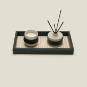 Le Coffret Sérénité transforme votre espace en un véritable havre de calme. La bougie diffuse une lumière douce, le diffuseur emplit la pièce d’un parfum subtil et apaisant, tandis que le plateau en cuir et feuille de palmier accueille vos objets avec élégance. Chaque détail a été pensé pour créer une atmosphère harmonieuse, où détente et style se rencontrent au quotidien.